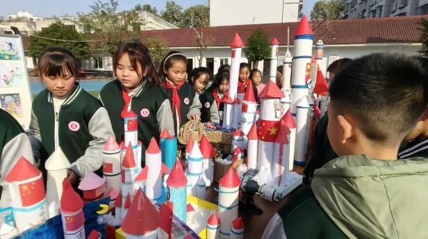 三四年级学生化身“城市建筑师”,用纸板、吸管等材料搭建出立交桥、生态建筑群;五六年级学生则胸怀“航天梦”,亲手制作火箭模型、月球基地。