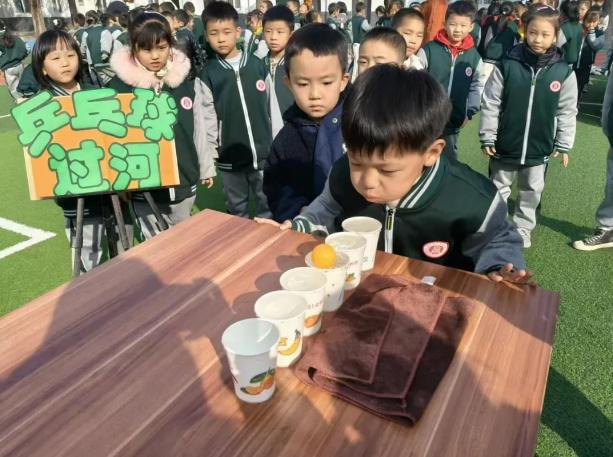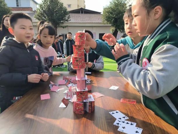 集体项目赛场气氛热烈,低年级“乒乓球过河”中,孩子们鼓腮吹气护送小球前行;中年级“纸牌搭高”现场屏息凝神,薄薄纸片渐次攀升成塔;高年级“赛车小能手”赛道欢呼雷动,改装遥控车如离弦之箭冲破终点。