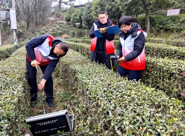 在南郑区茶园里,气象科技小队实地测量不同海拔高度茶树越冬期土壤含墒量,现场分析墒情数据,结合开春后气温预测,为茶园管理人员提供通俗易懂的农事指导建议,助力春茶稳产提质。